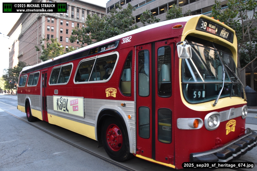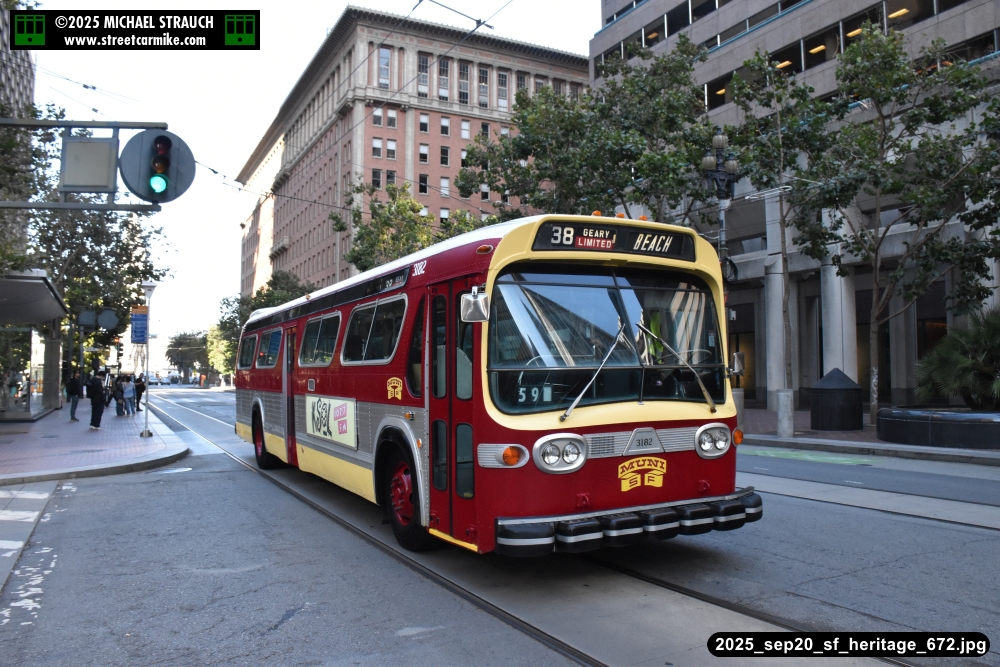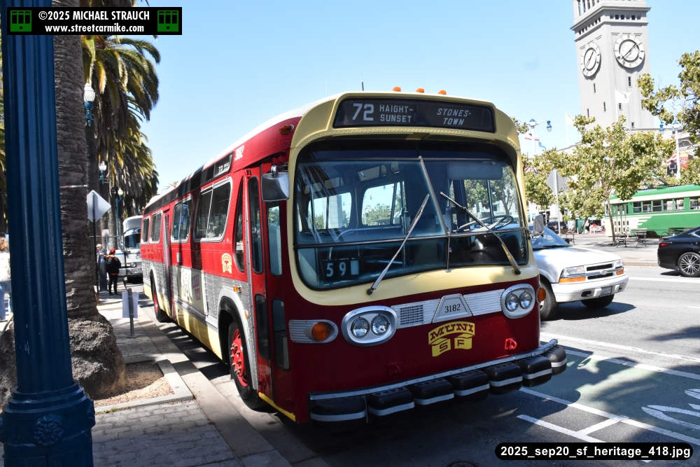 Also seen parked on Embarcadero were privately owned Muni 3182, VTA 9911, and the Pacific Bus Museum's